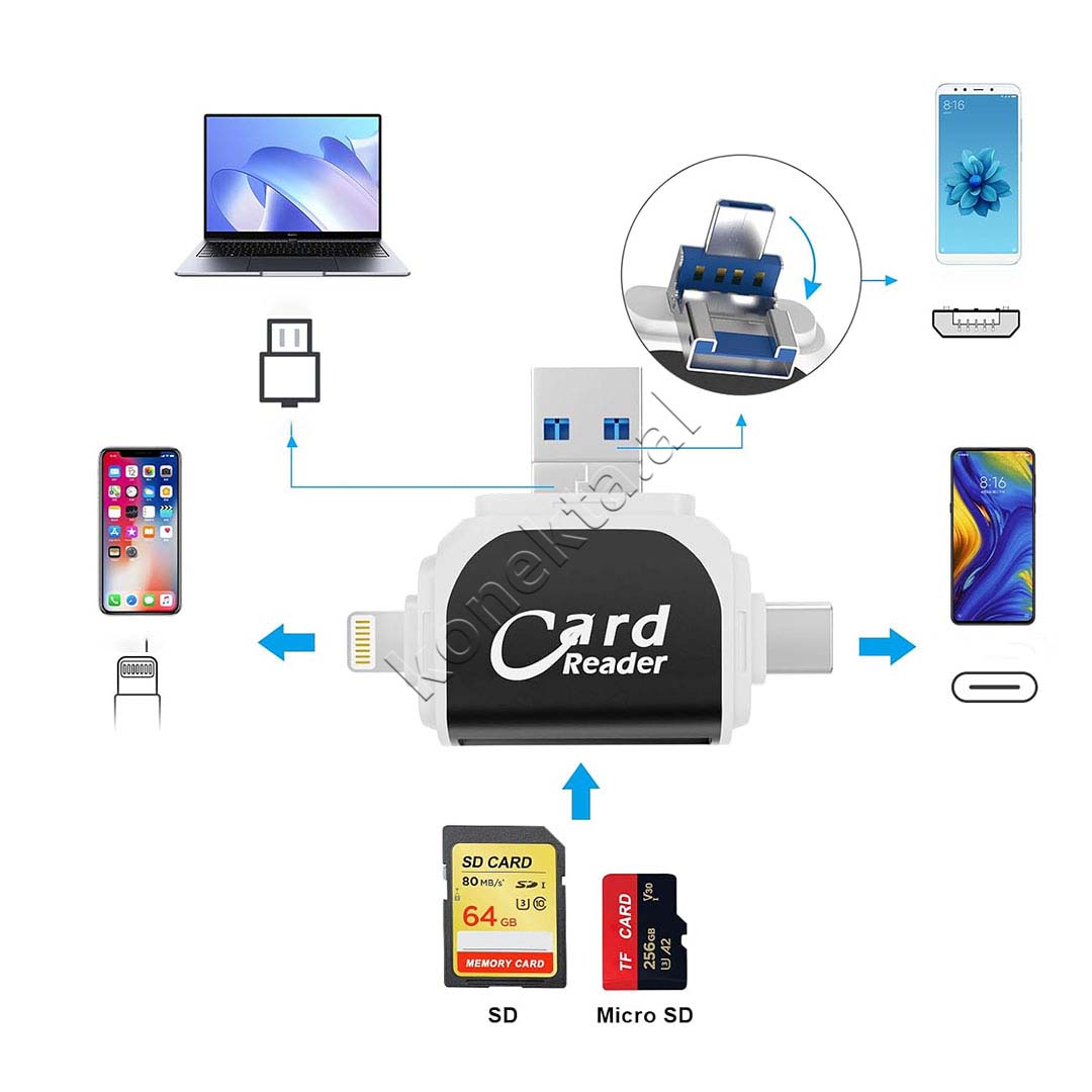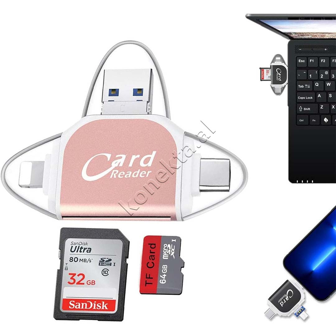 Adaptor Me Portë USB-A, USB-C dhe Lightning Për Kartë TF Dhe SD