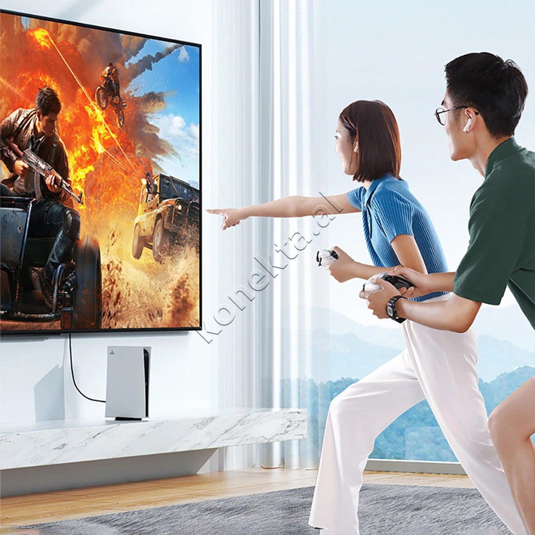 PROJEKTUAR PER GAMING : I PERSHTATSHEM PER PLAYSTATION DHE NINTENDO SWITCH, MUNDESON TRANSMETIMIN E AUDIOS NGA KONSOLA DREJT KUFJEVE OSE ALTOPARLANTEVE BLUETOOTH.