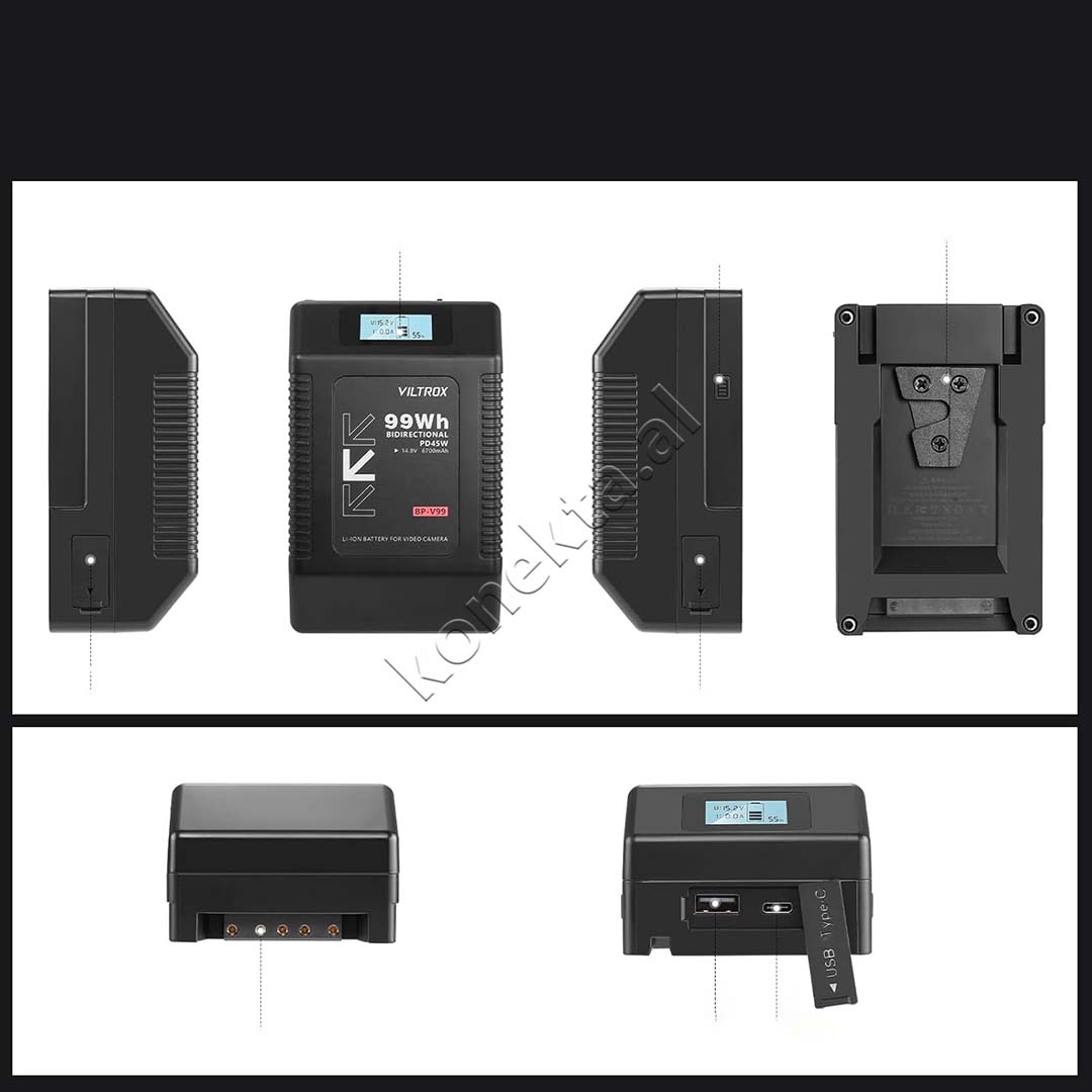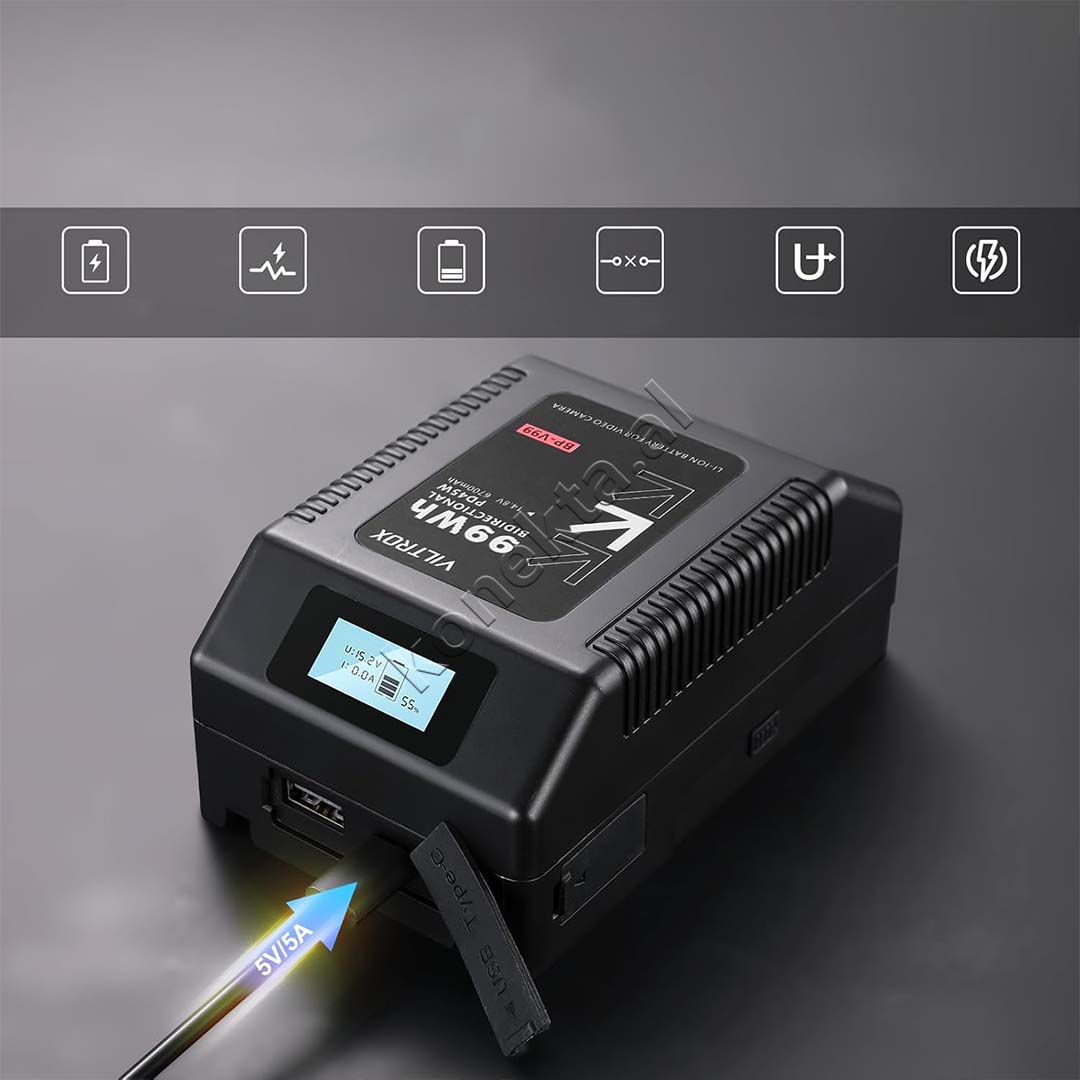 SHERBEN PER PAJISJE TE SHUMTA : BATERIA V-MOUNT ME KAPACITET 99WH OFRON ENERGJI TE QENDRUESHME PER KAMERA PROFESIONALE, MONITORE, NDRIÇUES LED DHE PAJISJE TE TJERA FOTOGRAFIKE. MUND TE PERDORET GJITHASHTU SI BURIM ENERGJIE PER PAJISJE PORTATIVE SI SMARTPHONE, ORA INTELIGJENTE APO LAPTOPE PERMES DALJEVE D-TAP DHE USB TYPE-C.